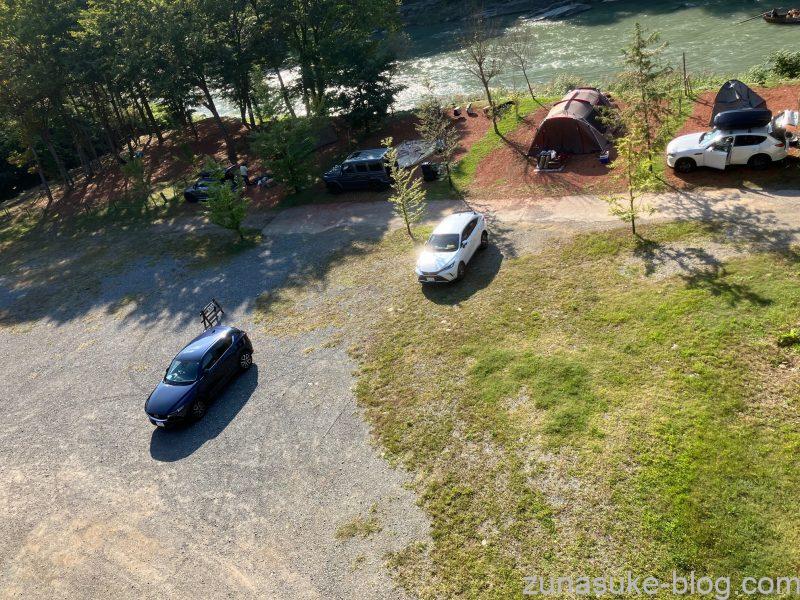 オートキャンプ場の最大のメリットの一つは、車をそのままサイトに停めて利用できること。