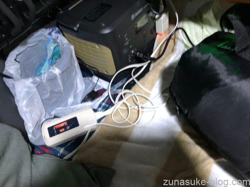 車中泊ではポータブル電源を使用してLEDライトと電気毛布を活用し、快適に就寝できました。