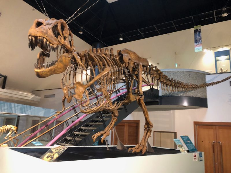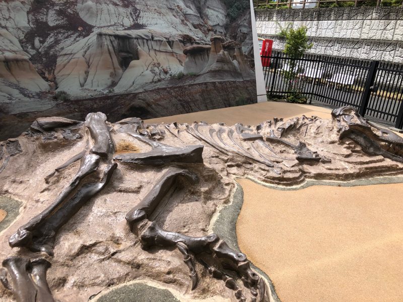 屋外の写真スポットでは、ティラノサウルスの産状骨格があり、発掘風景が復元されています。