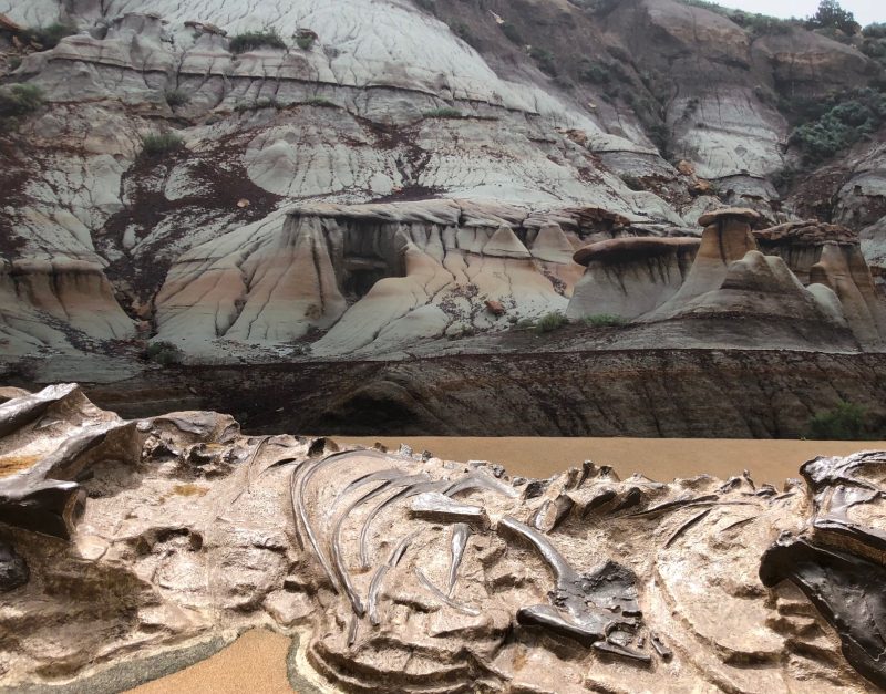 地溝帯つまり溝状の地形となったことによって、かつて恐竜が歩いていた地面の部分が壁となって露出した経緯があります。
