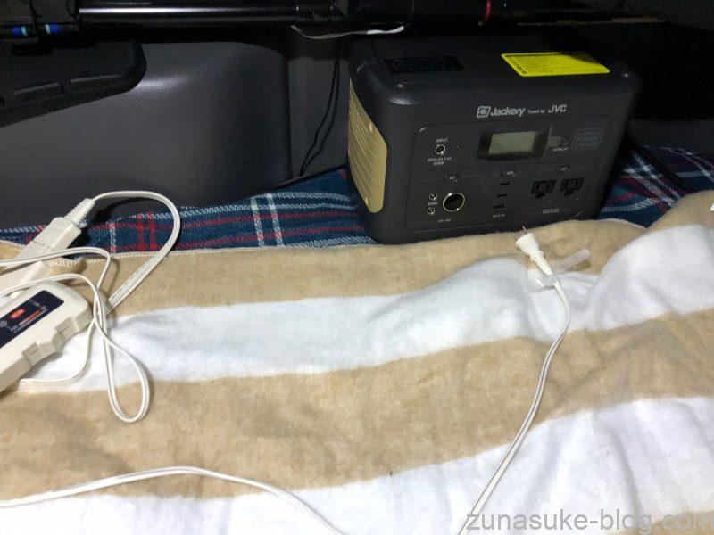 電気敷毛布は60W~70Wが消費電力なので500Wクラスのポータブル電源でも一晩持ちますが、ポータブルヒーターでは一晩は持ちません。