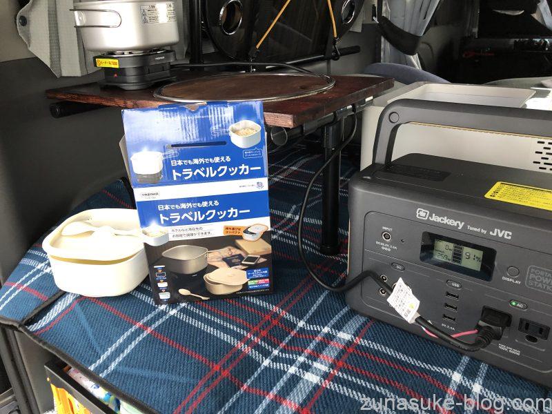車内で料理を楽しむことも、車中泊キャンプの醍醐味。私は500Wクラスのポータブル電源で使えるコンパクトなキッチン用品、省電力の炊飯器やトラベルクッカーを使って調理しています。